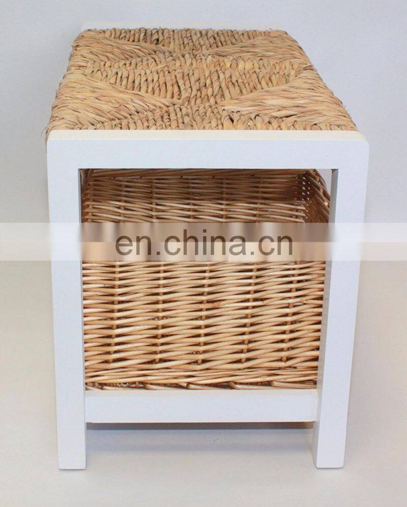 White Two Seater Wooden Storage Bench With Wicker Baskets and Seating