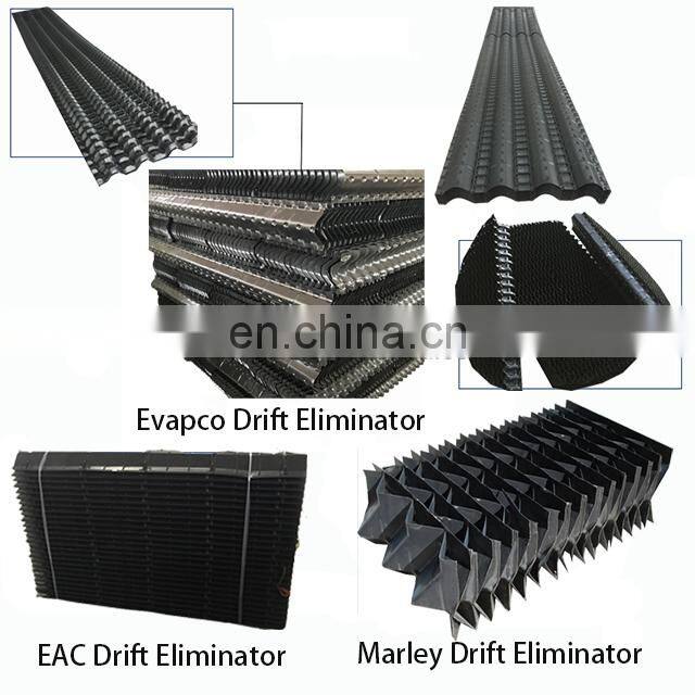 Drift Eliminators, made out of rigid PVC, are designed to remove entrained particles from air steam efficiently, with minimum pressure drop, thereby reducing the fan power requirement when the air passes through the Drift Eliminator. Water droplets are separated from the air drift at the three direction change points on the drift eliminator.