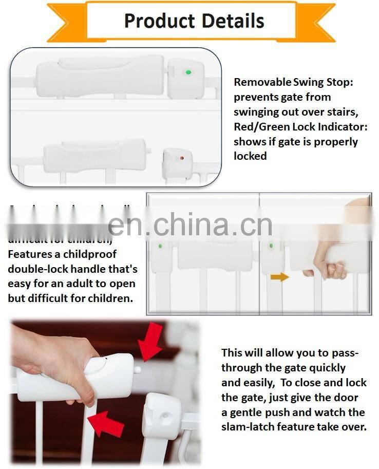 2.Removable Swing Stop: prevents gate from swinging out over stairs, Red/Green Lock Indicator: shows if gate is properly locked.