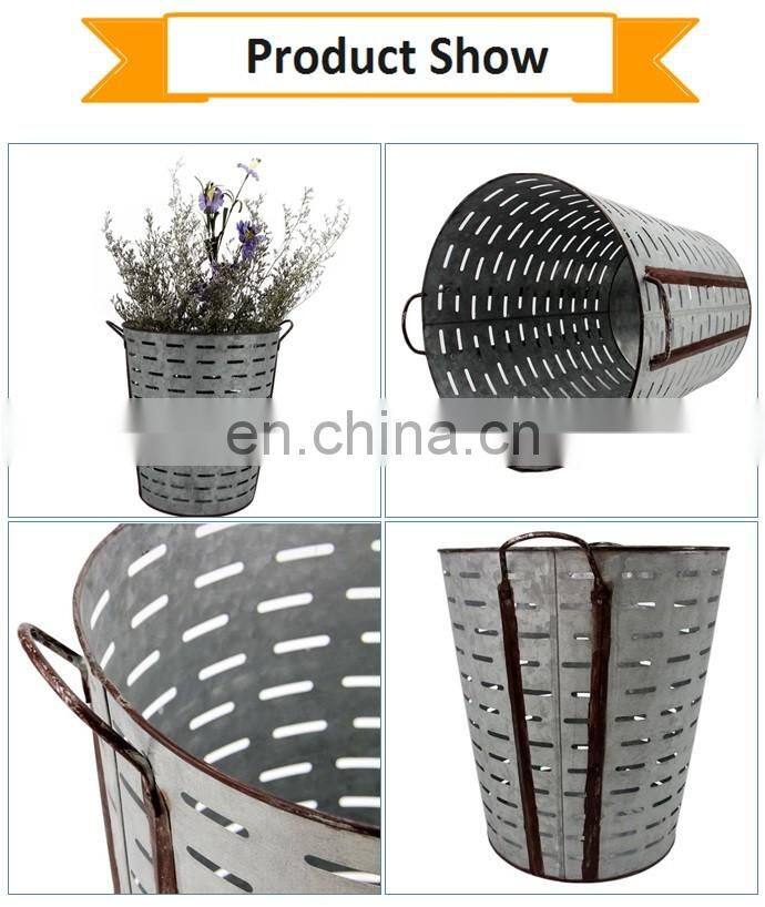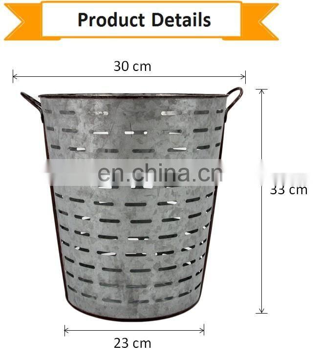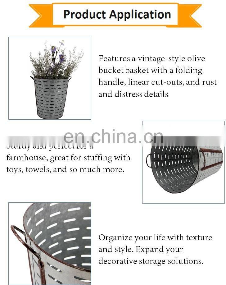 1. Features a vintage-style olive bucket basket with stationary handles, linear cut-outs, and rust details.