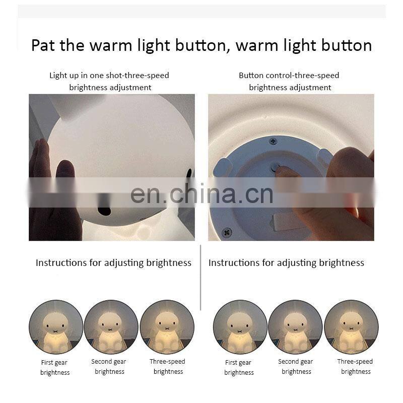 2. Tap the squishy bunny kids night light surface to switch modes-warm white light mode, 7 color changing light mode and standby mode. You can stop on any color you like. The change in color is a great way to bring a certain atmosphere to your room!