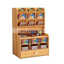 Office Supplies Wood Desk Organizer Pen Holder Accessories Storage Caddy With 1 Drawer, 7 Compartments