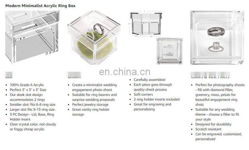 * Material: This acrylic display ring box is made using the best quality acrylic. Our experienced artisans take great care in constructing each handmade ring box. Safely packaged in an elegant white gift box.