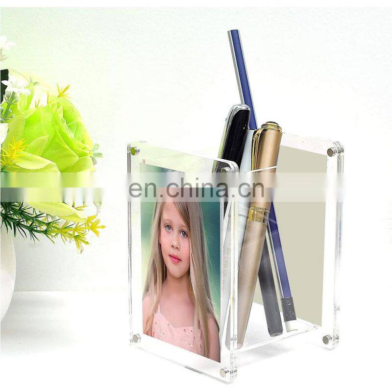 Clear Acrylic Pen Holder With Magnetic Photo Frame Pencil Organizer With 4 Sided Picture Frame