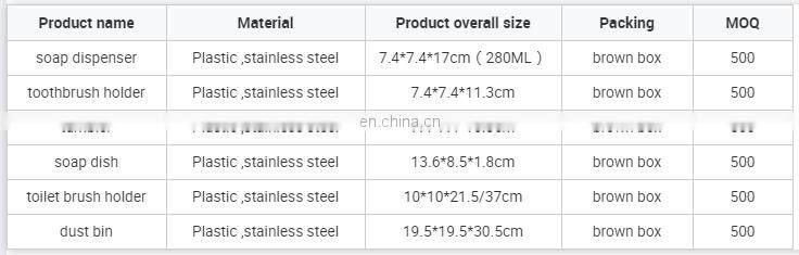 Product Name: | Plastic bathroom accessories | Packing: | Brown box | |||