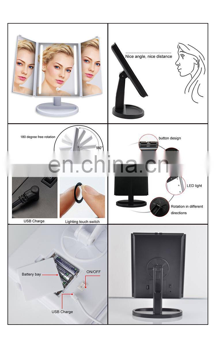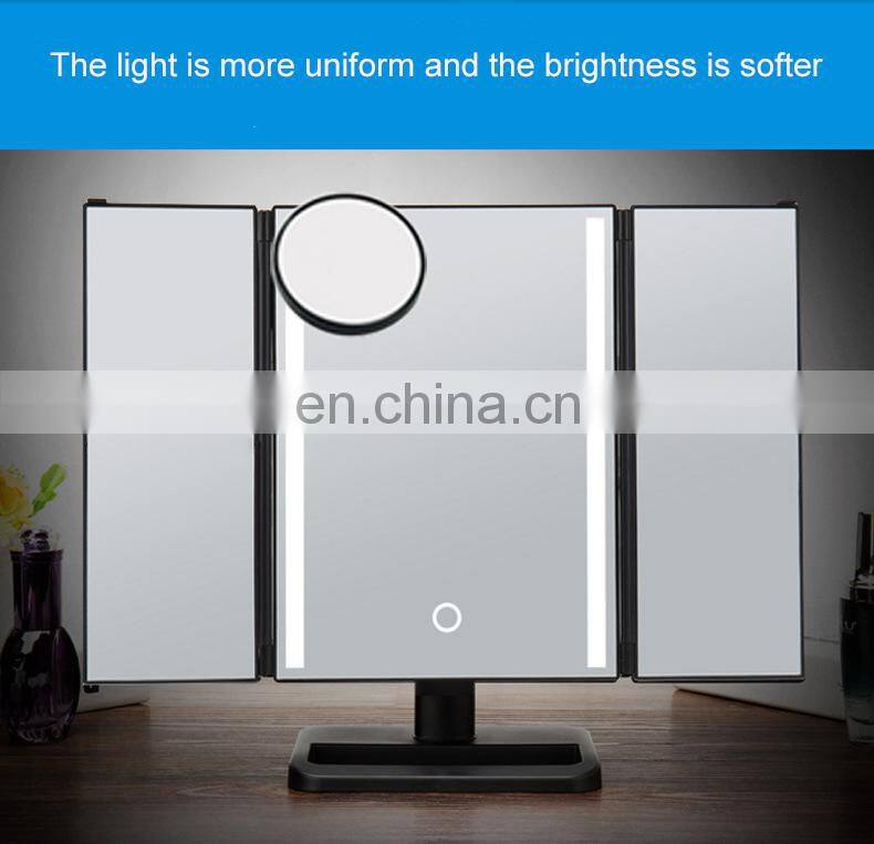Hot Selling Black Chargeable and Portable Led Glass Lighted Makeup Mirror Trifold Desktop Magnifying Makeup Mirror