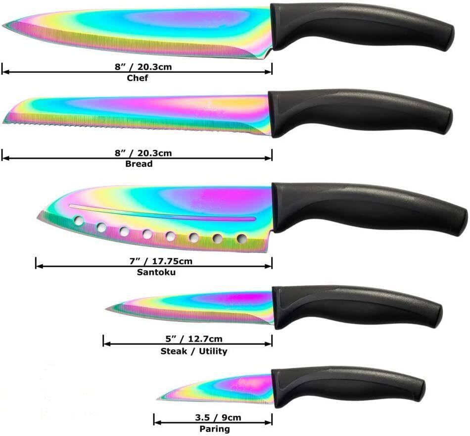 Kitchen Knife Set - 5 Chef Knives - Stainless Steel Blades with Ergonomic Handles & Rainbow Titanium Coating - Santoku, Bread, Chef, Utility and Paring Knife (Black Handle) |