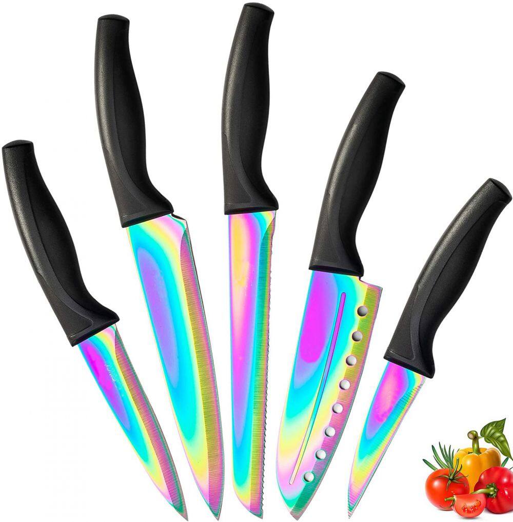 NEW designKitchen Knife Set - 5 Chef Knives - Stainless Steel Blades with Ergonomic Handles & Rainbow Titanium Coating - Santoku, Bread, Chef, Utility and Paring Knife (Black Handle) |
