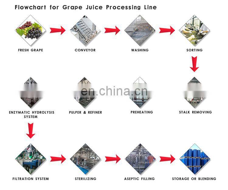 The grape production line is mainly composed of conveyor/elevator, washing & sorting machine, stalk removing machine, vacuum pressing system/extractor, enzymatic hydrolysis & filtration system, evaporator, sterilizer, aseptic filling machine and other equipment.