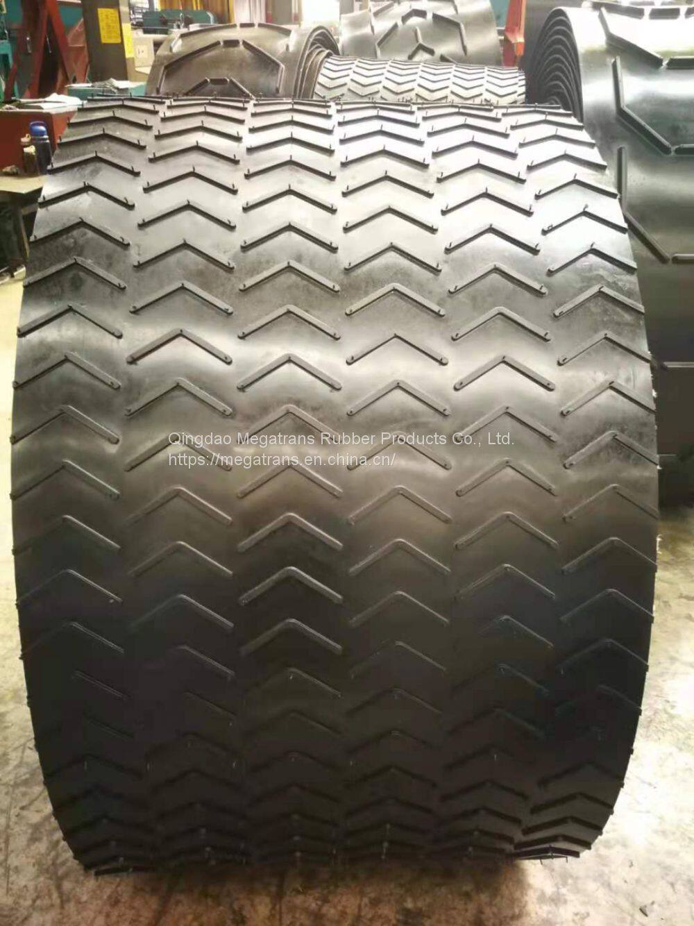 Chevron conveyor belt is designed for inclined transportation for conveying bulk material such as coal,sand,mineral,crop,package and bag depending on different loading material and inclined angle ro choose suitable cleat height and chevron type to prevent loading material from dropping down .