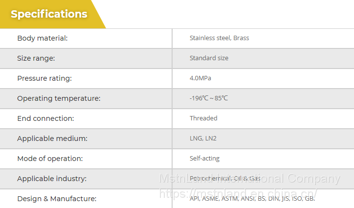 MstnLand's series of cryogenic gas relief valve is used as an ultrahigh pressure protection device for the low temperature storage tank, tanker and tank car, and the Cryogenic relief valve will be placed in a timely manner to ensure the safety and protection of the storage equipment and the person when the equipment or pipe pressure exceeds the prescribed pressure.