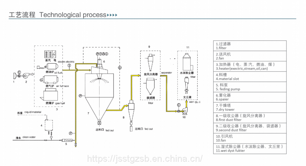 The air passes through the filter and heater, and enters the air distributor at the top of the dryer, and the hot air enters the dryer evenly in a spiral shape. The feed liquid is pumped from the feed liquid tank through the filter to the centrifugal atomizer of the dryer, so that the feed liquid is sprayed into extremely small mist droplets. It can be dried to powdery product within time. The finished product is discharged from the bottom of the drying tower and the cyclone separator, and the waste gas is discharged by the fan.