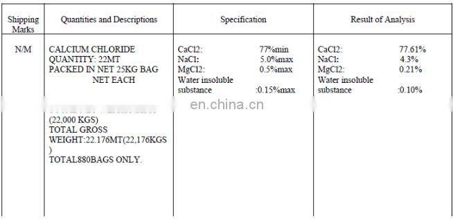 Used in highway, expressway, parking lot and port. As dryer to dry nitrogen, oxygen, hydrogen, hydrogen chloride and sulfur dioxide. Act as dehydration agent when producing alcohol, ester, aether and crylic acid. Calcium chloride is a kind of important cryogen used by freezing machine and when making ice. It can speeden hardness of concrete and increase cold resistance ability of construction sand pulop. In port, act as fog removing agent and dust collecting agent on road and fireproof agent of textile. Protective agent and refining agent of aluminum magnesium metallurgy.