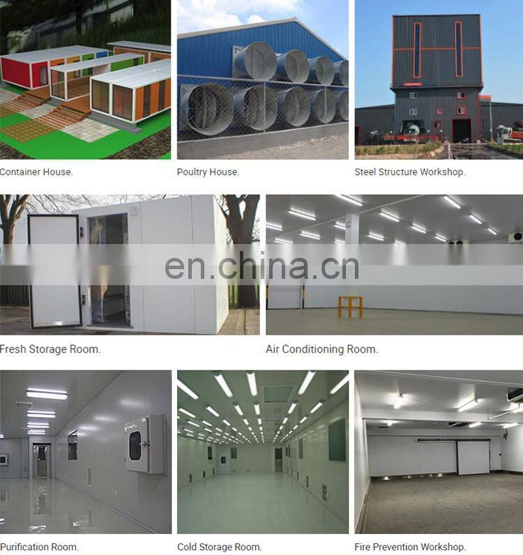 Sandwich Panel has the advantages of beautiful atmosphere, energy saving and heat preservation and long life.It is widely used in cold storage room, fresh storage room, various purification rooms, air conditioning room, steel structure workshop, fire prevention workshop, activity board room, chicken house, etc.