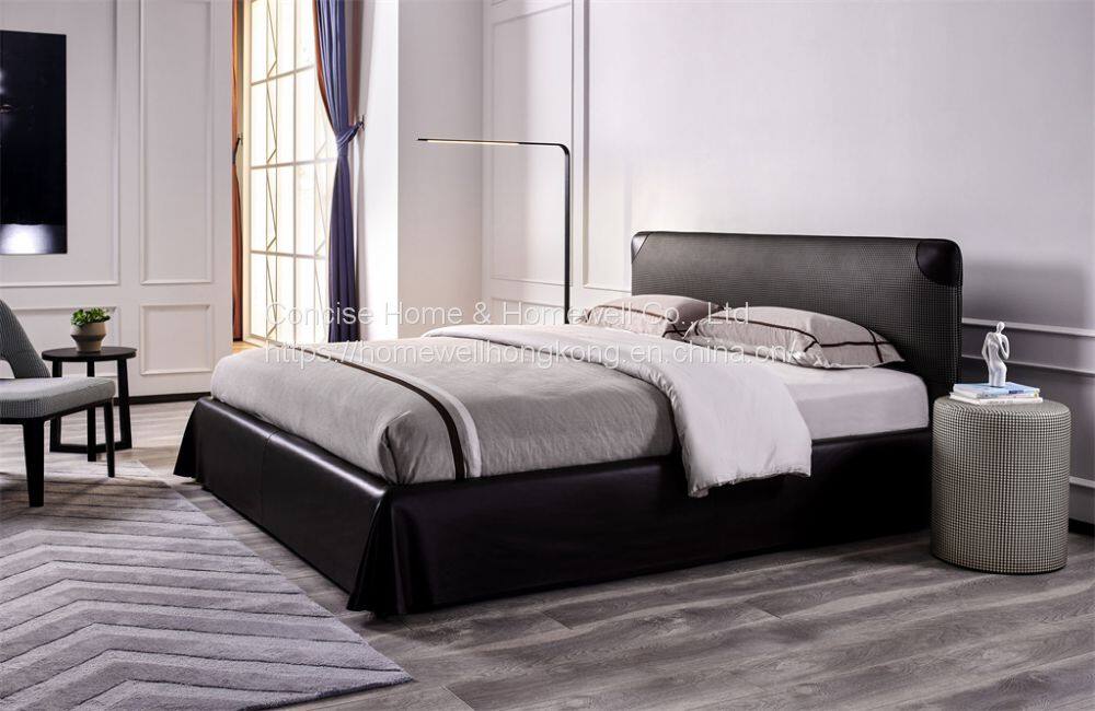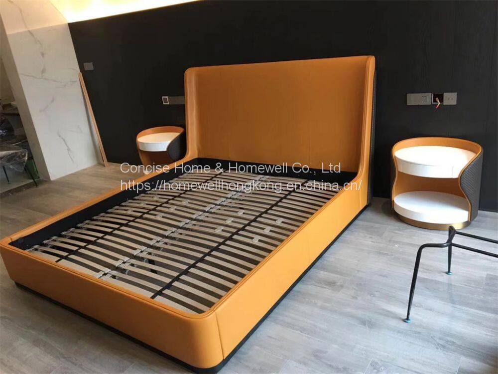 BB-1603-15 minimalist bed with genuine leather and imported PU upholstered, 2pcs quatra of round genuine leather deco on headboard corner like eyes, make it more decorative and innovative, headboard front with imported PU leather stitched, bed sides and footboard covered by big size genuine leather.