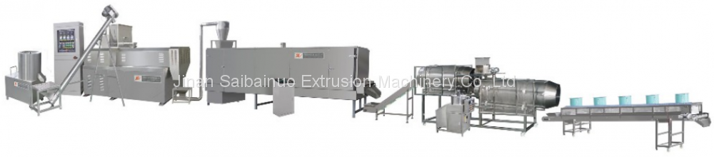Mixer-- Screw conveyor-- Twin-screw extruder-- Air Conveyor-- Gas/Electricity Dryer--Hoister--Oil sprayer-- Flavoring Roller-- Cooling conveyor--Packaging