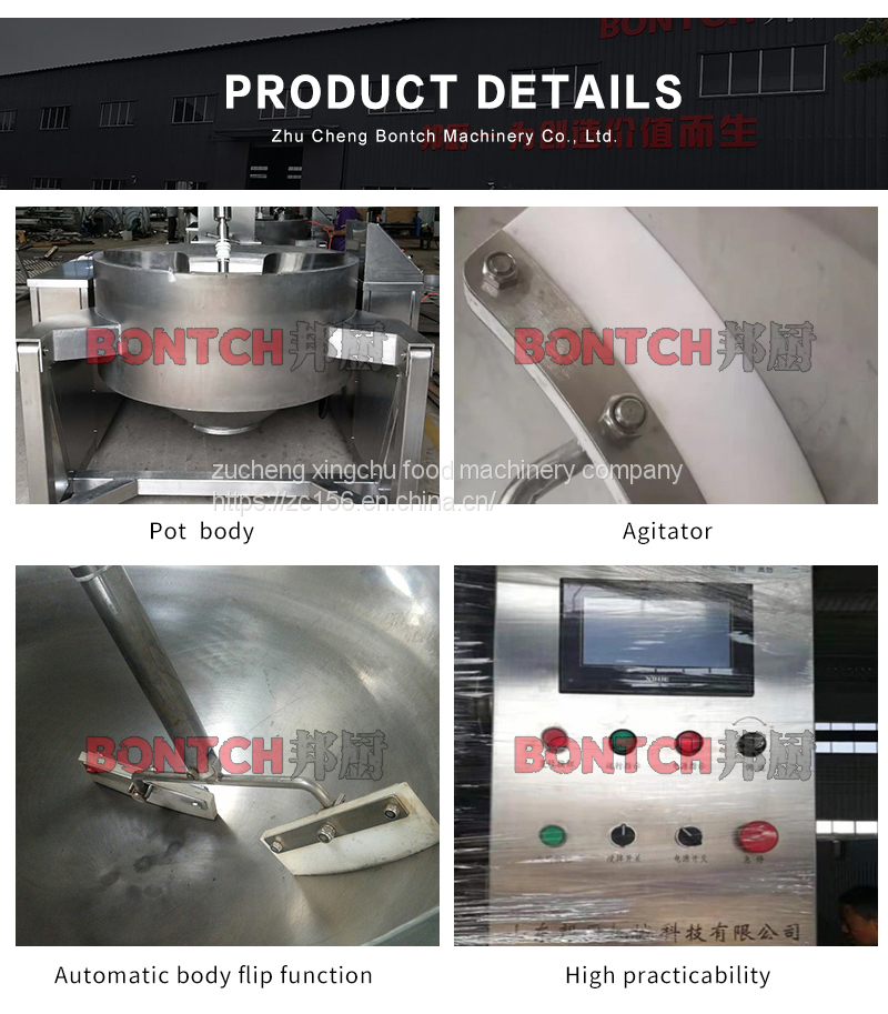 Also known as steam pot, cooking pot, sandwich steam pot. It usually consists of a pot body and legs. The pot body is a double-layer structure composed of an inner and outer spherical pot body, and the middle layer is heated by steam. There are fixed, tiltable, stirring and other styles. The jacketed pot has the characteristics of large heating area, high thermal efficiency, uniform heating, short boiling time of liquid material, easy control of heating temperature, beautiful appearance, easy installation, convenient operation, safety and reliability.
