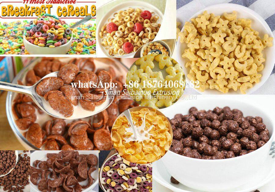 Corn flakes/Breakfast cereal is a kind of crispy food, with the characteristics of hard to be steeped broken and strong grain taste. It is mainly made from corn flour and other grains powder. It can be used as a snack or served with milk and coffee.Change molds and choose the right process to produce circles, balls, sheets, stars, letters and other products,and produce core filling snack food, filling biscuit ,nutrition breakfast, corn flakes and other puffed foods.