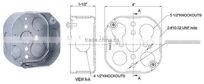 4" octagon, 1-1/2" deep boxes with (4) 1/2" side knockouts and (5) 1/2" bottom knockouts are used to install ceiling and wall lighting fixtures, fans, or convenience outlets and devices. They are made with a versatile combination head screw.