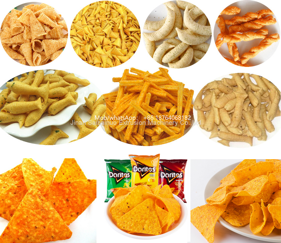 This Doritos Making Machine Production Line can produce many kind shapes fried snacks by changing the mould.