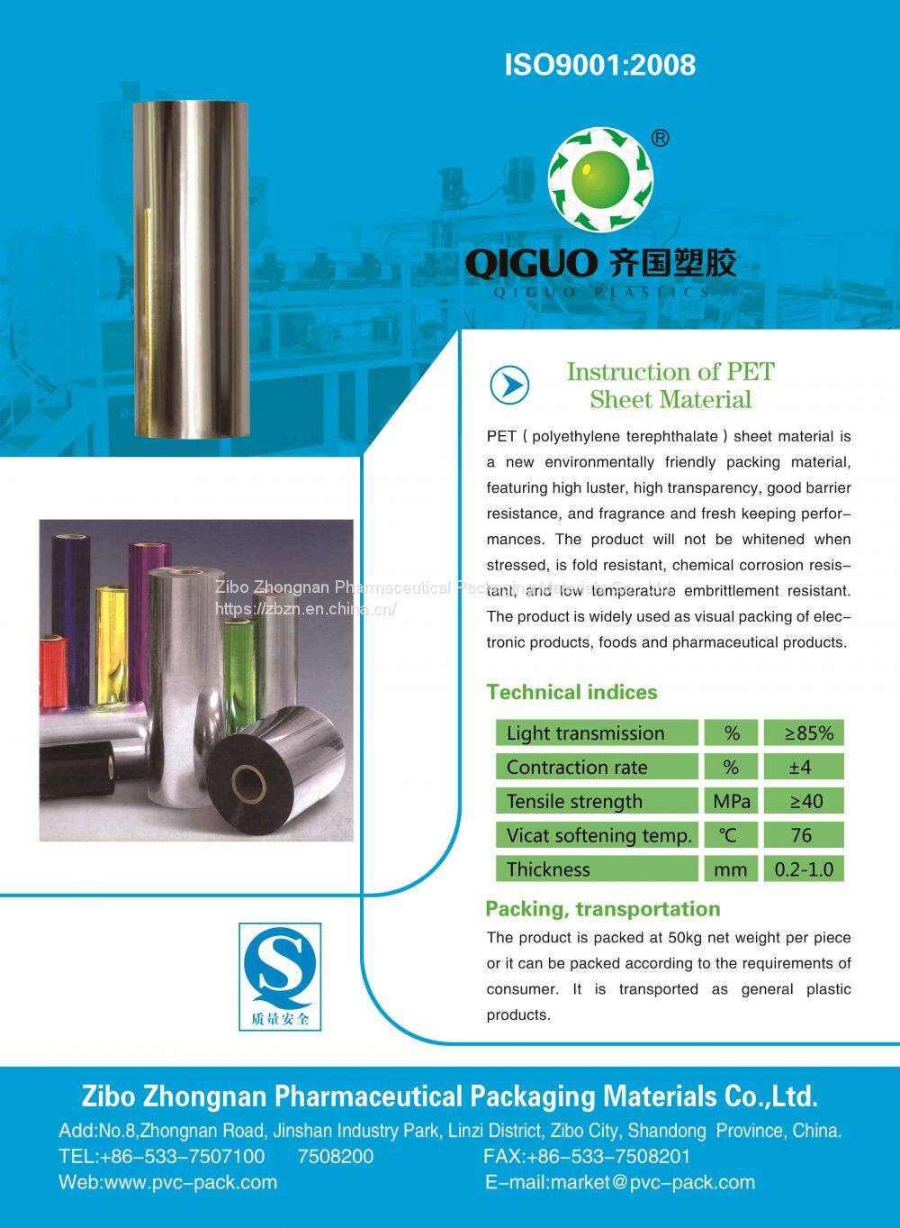 Characteristics: PET (polyethylene terephthalate)sheet material is a new environmentally friendly packing material, featuring high luster, high transparency, good barrier resistance, and fragrance and fresh keeping performances. The product will not be whitened when stressed, is fold resistent, chemical corrosin resistant, and low temperature embrittlement resistant.The product is widely used as visual packing of electronic products, foods and pharmaceutical products.