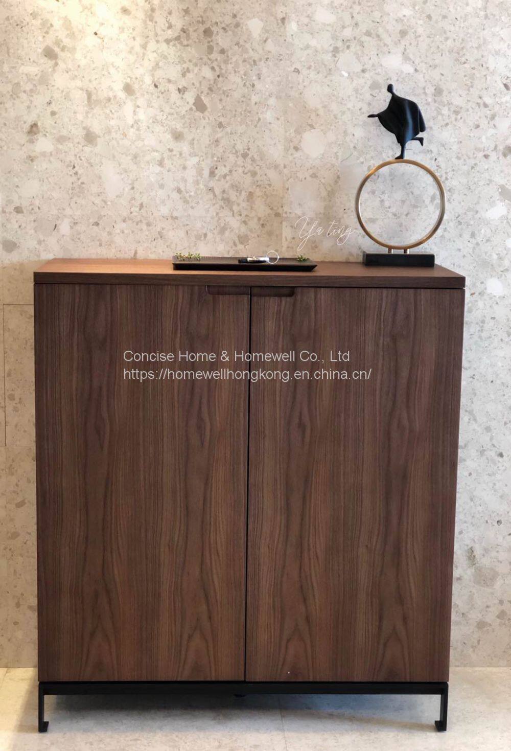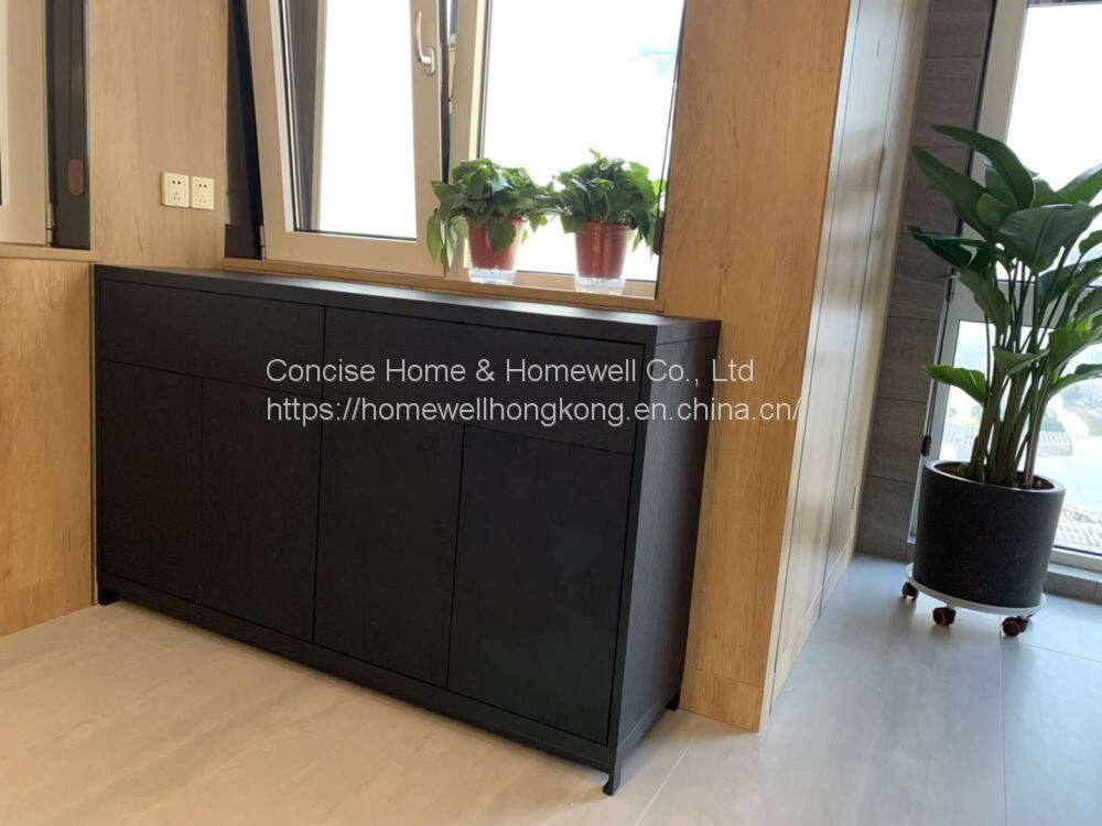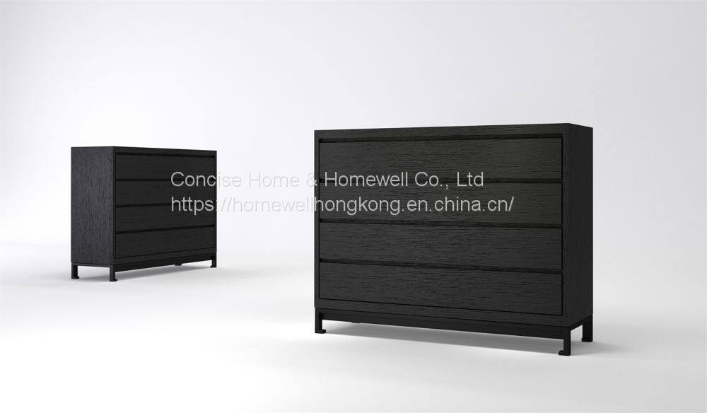 This buffet sideboard DH1524 is made by Concise Home furniture fty, modern design with 4 drawers cabinet/sideboard, with black oak veneered body and metal base in black powder coated, drawers with soft-closing system and bevel-cutted handles.