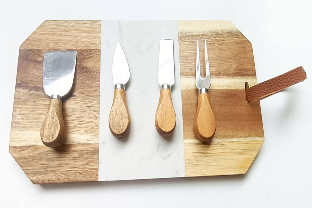 Hot sale marbleizing kitchen acacia wood cheese cutting board with knives set