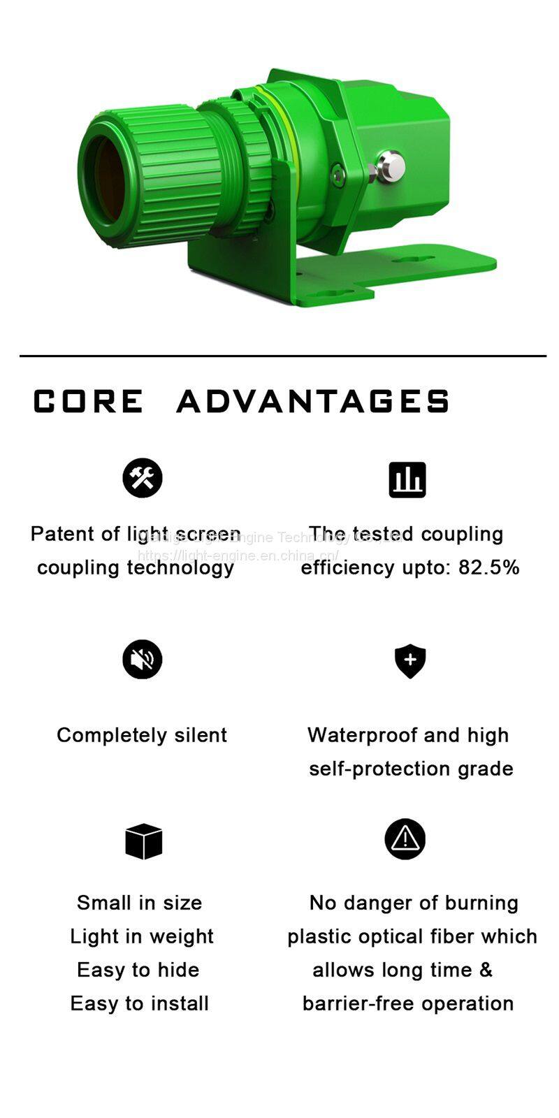 Applied in optical fiber conduction of lighting, our independent R & D of light screen coupling system, for the first time meets the requirements of lighting level at the end of conduction of lighting, which achieves the middle and far distance efficient optical fiber transmission of visible light and enables safe and healthy lighting.