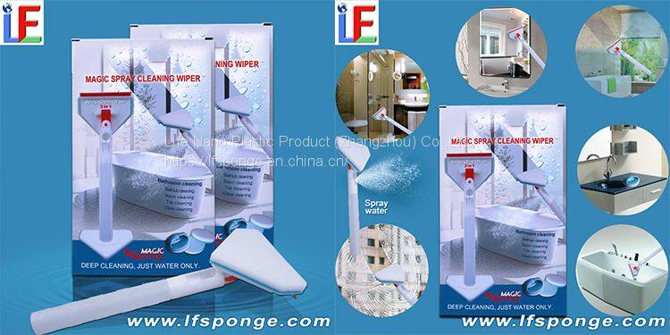 Magic Spray cleaning wiper is a new type of bathroom kit that integrates water spray, cleaning and wiping.The head use melamine sponge with strong cleaning ability, it can quickly cleans stubborn dirt, especially soap scum from shower gels and shampoos in the bathroom, remove stains and stagnat water, it is a good helper for you to clean work.