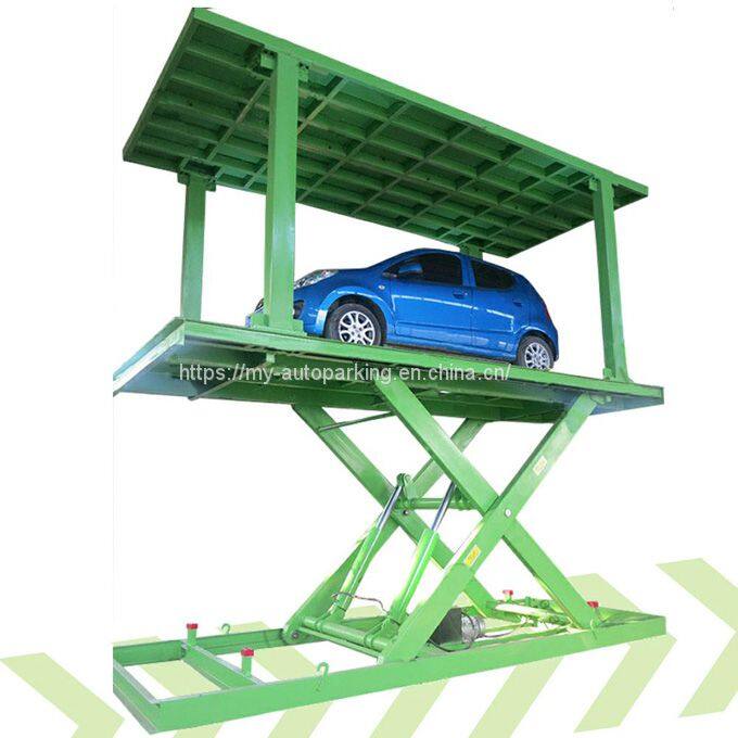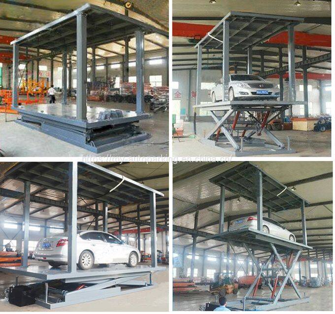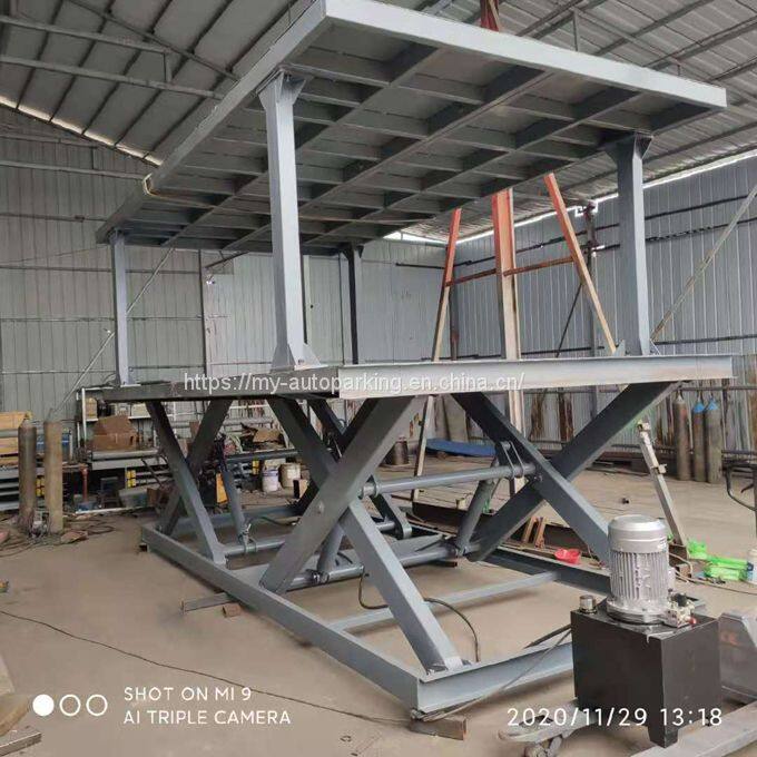 This pit design scissor parking lift is designed for 2 cars. Usually, the bottom level car is underground in a pit, the upper level car is above ground. The two car spaces are united as a whole unit and lifted up and down together, when the car platform is lifted to the ground level,