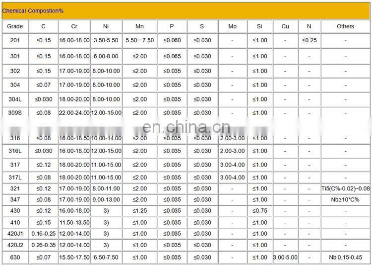 Material | 201, 202, 301, 302, 303, 304, 304L, 304H, 310S, 316, 316L, 317L, 321,310S 309S, 410, 410S,420, 430, 431, 440A,904L | |
