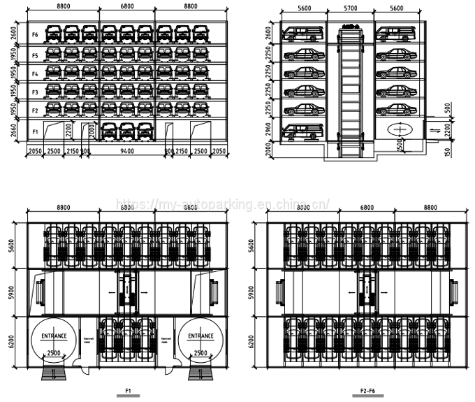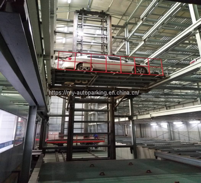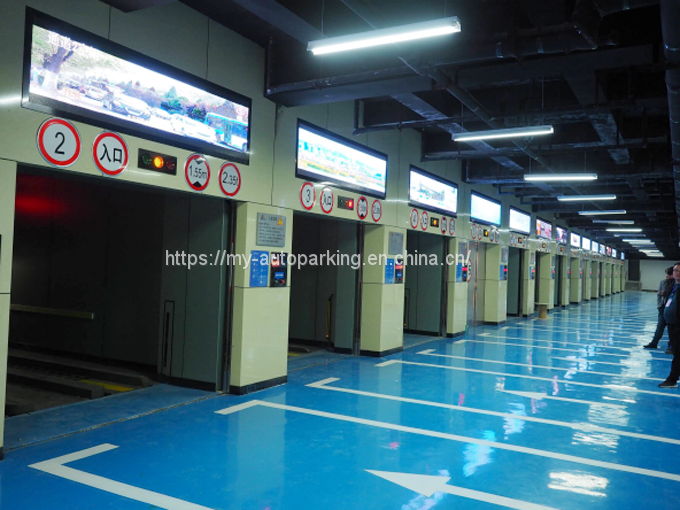 2) When storing a car: The driver drives the vehicle to the entrance and exit of the equipment and swipes the card; The automatic door opens and the driver drives the vehicle into the access room; At the prompt of the guidance system, the driver stops the vehicle and leaves the vehicle; The driver leaves the access room and swipes again at the entrance and exit; The automatic door is closed, the equipment performs centering and rectification on the vehicle, etc. At the same time, the elevator (with traverse trolley and carrier) runs to be flush with access floor; The carrier conveys the vehicle to the traverse trolley on the elevator; The elevator runs up to the target layer; The traverse trolley moves horizontally to the corresponding position of the parking space; The carrier conveys the vehicle to the target parking space; the storage is completed.