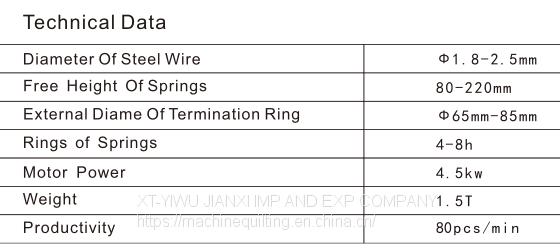 The machine is tutomatic equipment which specially combines coil and knot spring for soft-furnture. Heat treatment,one-time completion of, it is easy to be operated safeguarded and high in productivity low in labor. It is controlled by computer,therefore guaranteed operation of main engine.