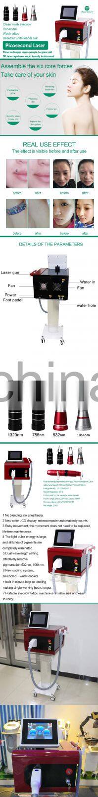 Picosecond laser machine make tattoo & pigment removal treatment process from 5 to 10 times reduced to 2 to 4 times,greatly reduce the treatment and recovery time,with fast and obvious effective.