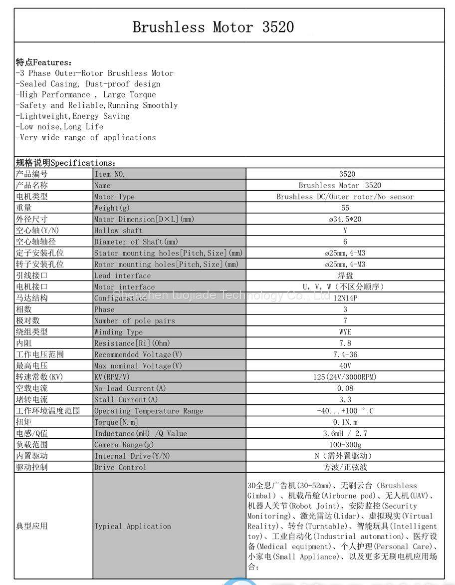 Home > Products > Brushless DC motor > Brushless PTZ / Airborne Pod Brushless Motor 3520 DC 24v3000 Rpm Kv125 Customizable