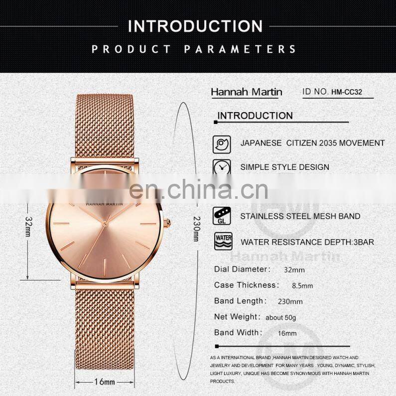 Home > Products > Popular Brands > HANNAH MARTIN CC32 Wholesale Fashion Girls Quartz Watch Low Cost Mesh Band Water Resist Analog Display Simple Student Wristwatch