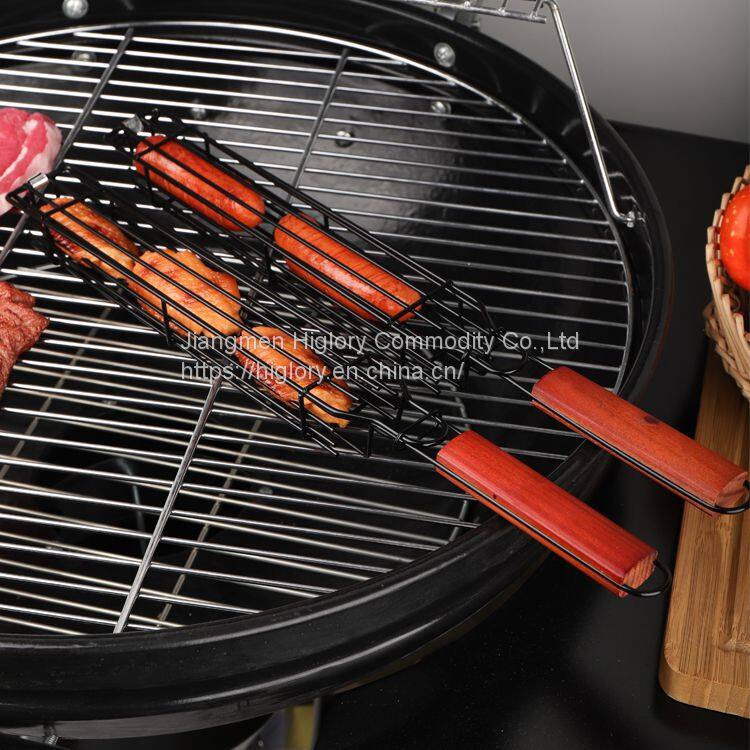 BBQ Fish Grill Basket Chrome Plated BBQ Barbecue Grill Accessories Mesh Wire Fish Basket With Wood Handle