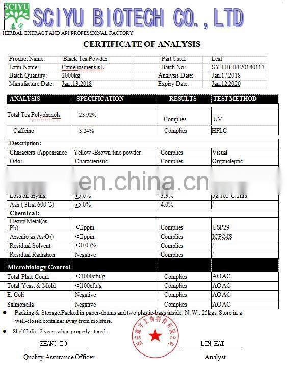 Black Tea Extract is Black color of dry tea and brewing tea to red as the keynote, so called black tea. To make the product suitable for the new shoots of tea as raw material, withering, rolling, fermentation, drying and other typical process is refined.During the fermented process, black tea formed more active ingredients and theaflavins. They contain high amounts of Vitamin C, along with calcium, potassium, magnesium, iron, zinc, sodium, copper, manganese, and fluoride. They also have more anti-oxidants than green tea, and are anti-viral, anti-spasmodic and anti-allergic.In addition to all of these health benefits, black teas are also less astringent and have a mellower flavor than green or black teas. Perfect for drinking throughout the day, and also suitable for all ages.