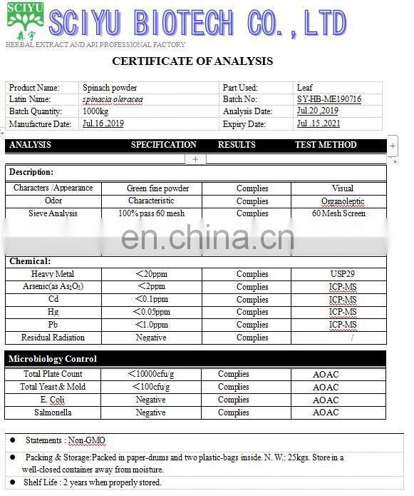 2. Spinach powder can promote growing development and enhance disease resistance. The carotene can become to be vitamin A in the body and maintain the health of the eyes and epithelium.