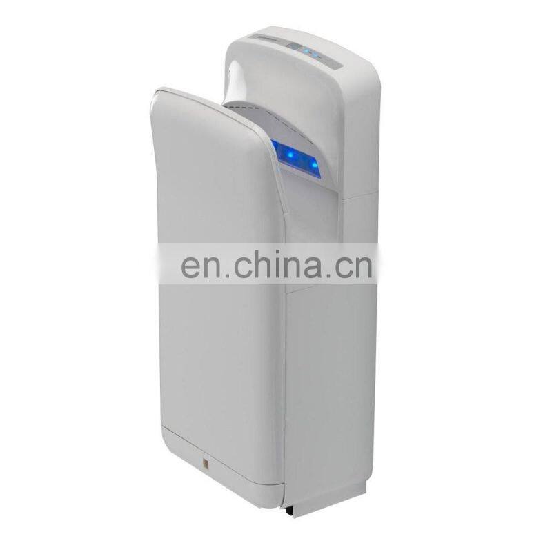 With the infrared sensor and chip control technology, it’s stable and convenient to operate the machine. With high power, high heating and large air volume, the hand drying is more efficient. The wind speed is moderate, and it is more comfortable when using. With concise appearance and the ultra-thin design, this machine is especially suitable for the clean room.With the automatic induction, double jet, quick drying time of 5 ~ 6 seconds with strong wind speed of 95 m/s, and the unique humanized design, by this machine, the floor will be kept dry and clean, which greatly improves the working efficiency.