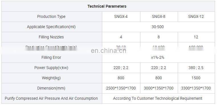 SNGX-4 Peristaltic pump type liquid filling machine filling plugging and camping machine can be applied for the pharmaceutical, medical and health supplies plant. The machine can automatically complete bottle unscrambling, bottle conveying, filling, and plug feeding, plugging, cap feeding and crimping. Touching parts are made of high quality stainless steel or non-toxic and non-polluting engineering plastics. The machine adopts automatic metering, tracking filling technology, simple operation, high efficiency automation. This machine can be used in production lines, and also can be used alone.