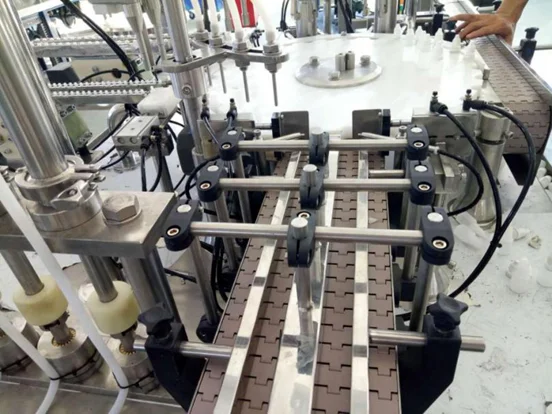 The linear-type filling is adopted. When a bottle gets to the filling station, it will be automatically stopped, the filling head moves down, and the filling is started, and the filling needle will rise along the liquid level. There is the optoelectronic sensor, there is no filling when there is no bottle, and the waste is avoided.