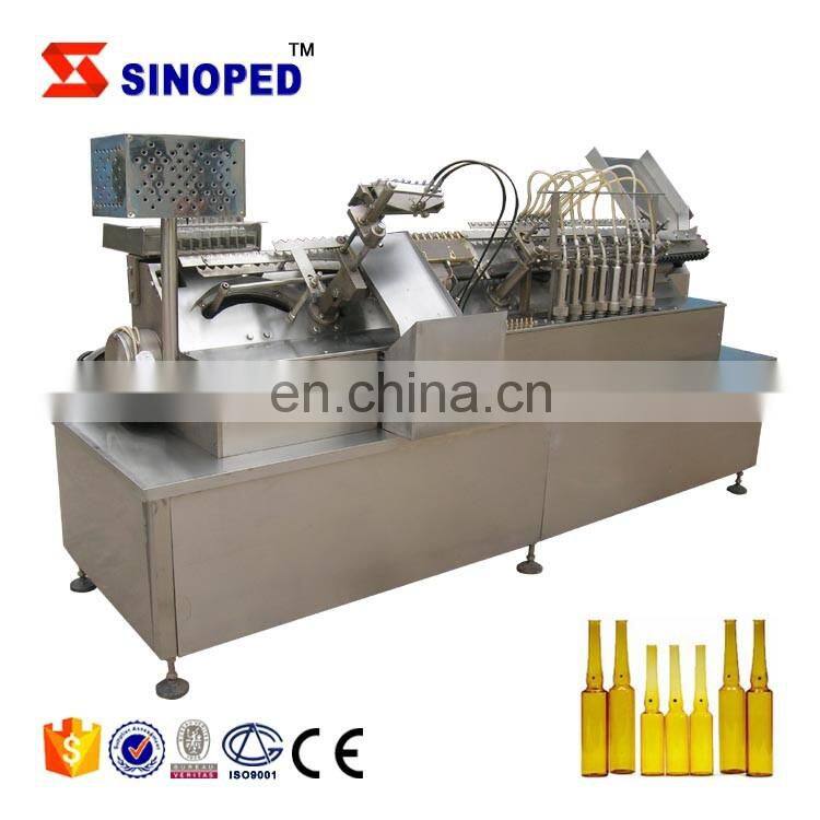 This product is a new type filling and sealing machine which had been recently researched, manufactured and developed by our company. It now becomes an upgrade product to replace ordinary ampule filling and sealing machine. Besides of some characters of the ordinary ampule wire‐drawing filling and sealing machine, e.g. adopting the chain and rectangular methods to transfer ampule, these methods will be able to stop transferring ampule under the condition of non‐stop machine; and adopting the mechanical stop‐filling instrument when lacking of ampule bottle, this new machine has also added some new‐type instruments of rotation speed adjustment and digital display, therefore the machine can easily control and find out the rotation speed of whole machine according to the product performance. In addition, this machine has been set many filling heads in filling working positions, besides filling liquid, it can also simultaneously meet requirements of filling compressed air and filling nitrogen both front and back; Ampule‐bottles moving in‐out will be smooth and steady when whole machine in operation, the product pass‐percent of this machine is quite high, therefore these machines have been extensively used in filling and sealing of pharmaceutics, health food production, cosmetics industry and some standard materials in scientific research departments.
