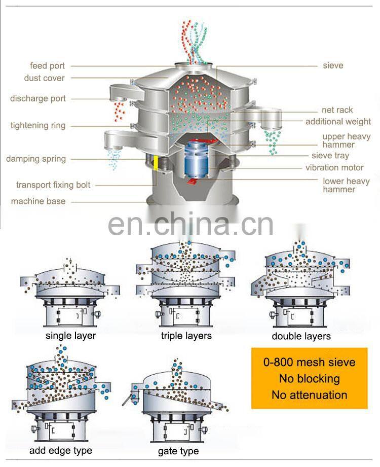The rotary vibrating screen is a high-precision fine powder screening machine with low noise and high efficiency. It takes 3-5 minutes to quickly change the screen. It has a fully enclosed structure and is suitable for screening and filtering particles, powder, mucus and other materials.