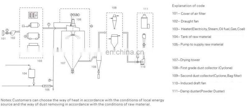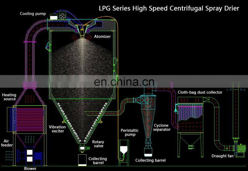 Spiral-shaped hot air evenly into the drying chamber. By passing through the high-speed centrifugal spray at the top of the tower, the material liquid will rotate and be sprayed into the extremely fine mist liquid beads.Through the very short time of contacting the heat air,the materials can be dried into the finished products. The finished products will separator. The waste gas will be discharged from blower.