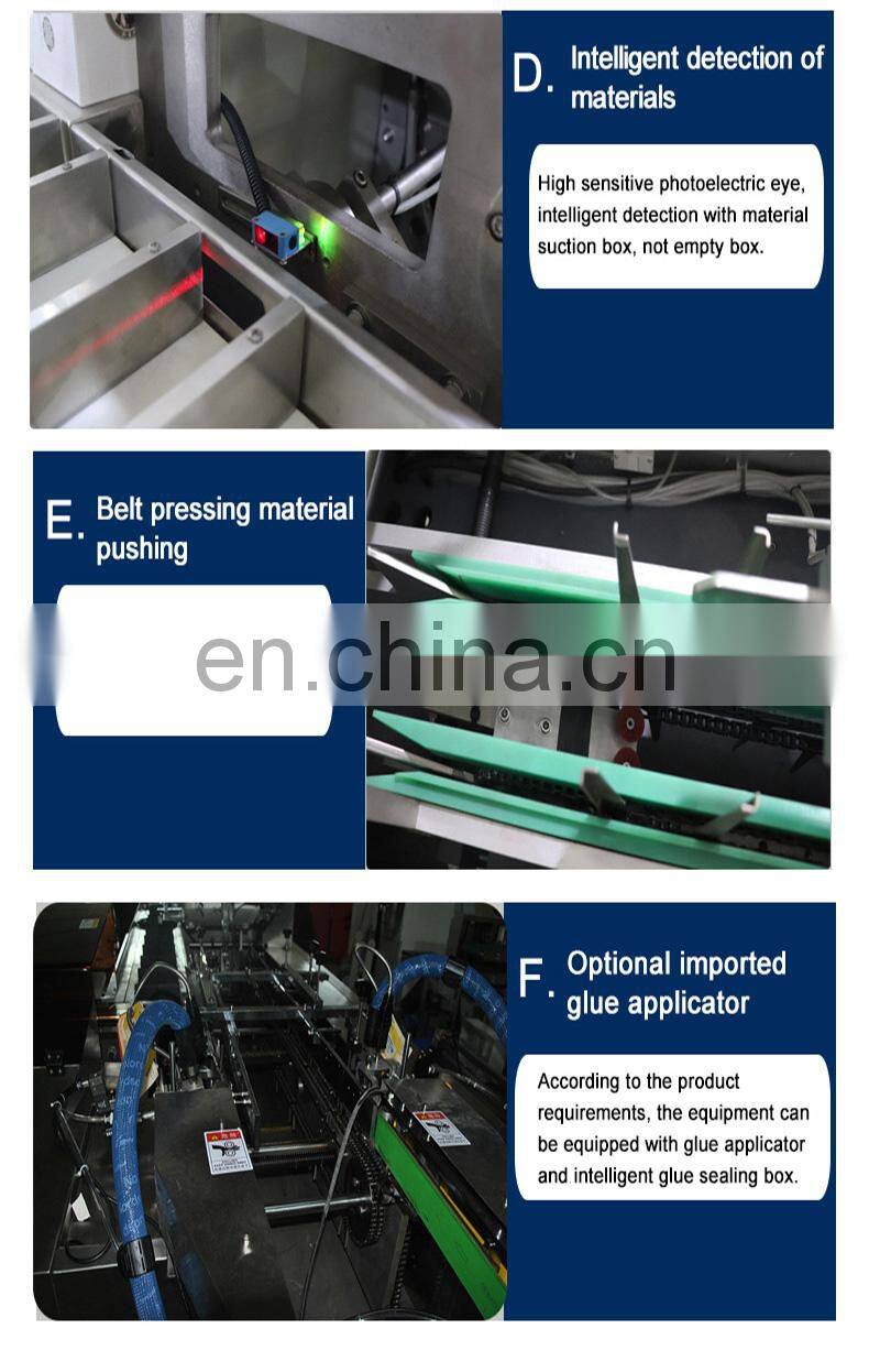 d.When the box’s feeding position is not correct, or there is no box, or there is no leaflet’s feeding, the machine will be stopped automatically.