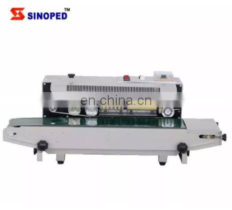 It is suitable for the sealing of plastic film, which adopts adjustable automatic thermostatic control system and step-less speed regulation driving mechanism and can realize the thermal sealing of plastic film packing automatically and continuously. Also it has functions of printing date of prouction, batch NO. etc. FR900 sealing machine is for food packing, other food processing machinery, also for pharma packing.