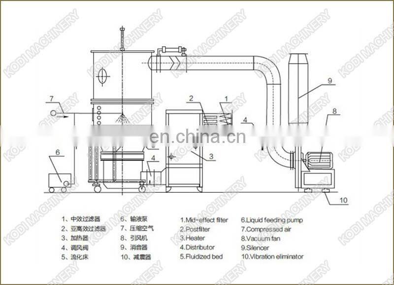 The Powder granule the container (fluidized bed) appear the state of fluidization. It is preheated and mixed with clean and heated air. At the same the solution of adhesive solvent is fogged and sprayed into the container. It makes the Same particles become granulating that contains adhesive. Being of unceasing dry through hot air, the moisture in the granulating is evaporated and the adhesive is solidification. The process is carried out continuously. Finally it forms ideal, uniform and porous granules.