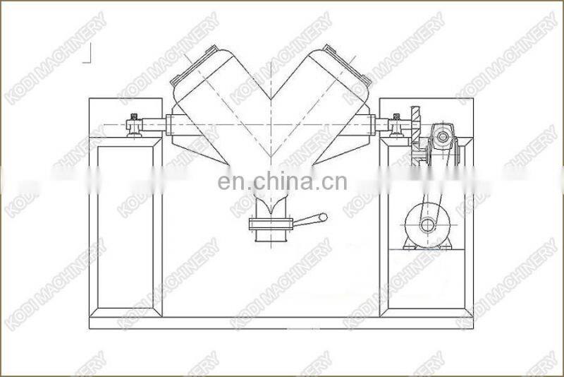 The V-shape Mixer cylinder is an asymmetric V-Shape. On the top there is a quick open turn cap for feeding. And there is a turn valve on the bottom for discharge.