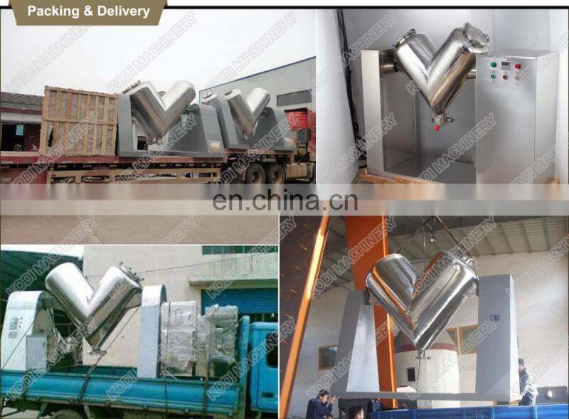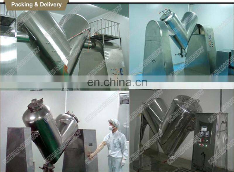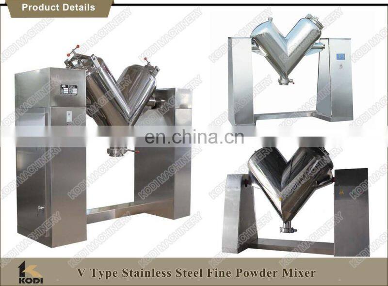 Unique structure of mixing tank, high mixing efficiency, free of dead corner and even mixing. The small powder V-shape Mixer is made of stainless steel with inside and outside walls polished. The machine can also increase to mix blend the founction compulsory. It can mix thin powder and more than two form powders including the materials that contain water.